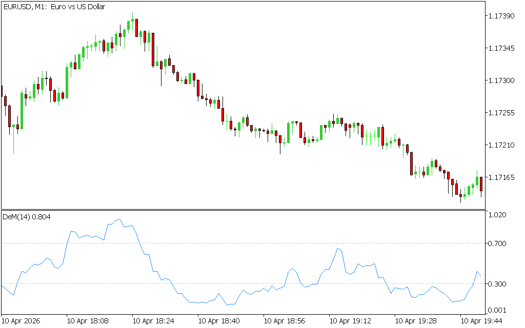 The DeMarker is displayed in a separate window and fluctuates between 0 and 1: