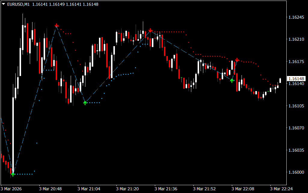 Dots mark support and resistance levels, assisting in determining potential reversal areas.