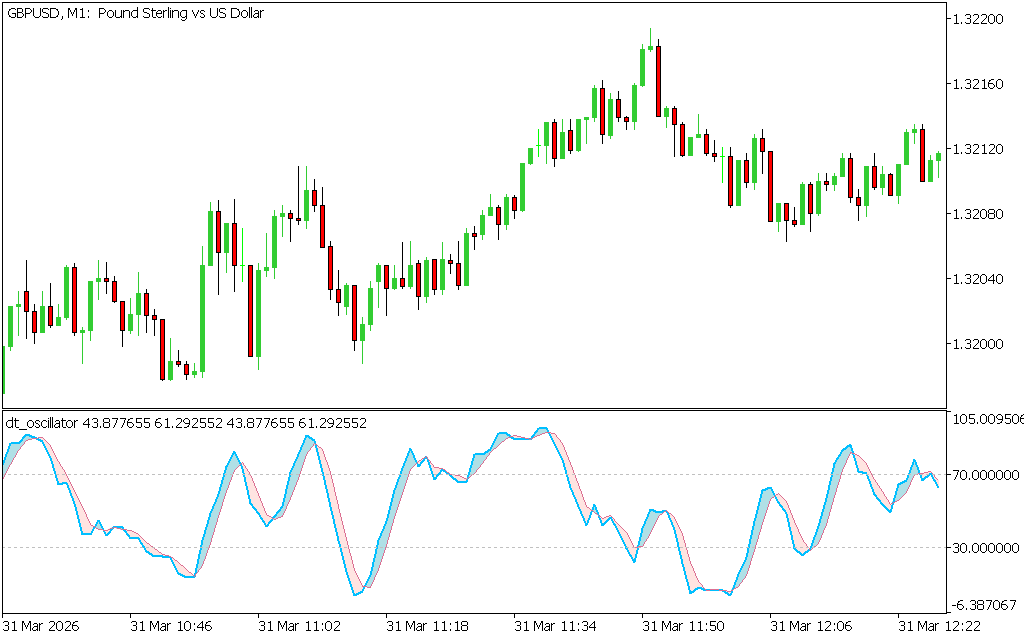 The DT Oscillator Indicator for MT5 is a hybrid technical tool that combines the Relative Strength Index (RSI) and Stochastic Oscillator to determine market trend direction. It fluctuates between 0 and 100, where 0 represents oversold conditions and 100 represents overbought conditions. This makes it a versatile indicator for identifying potential reversals and continuation signals.
