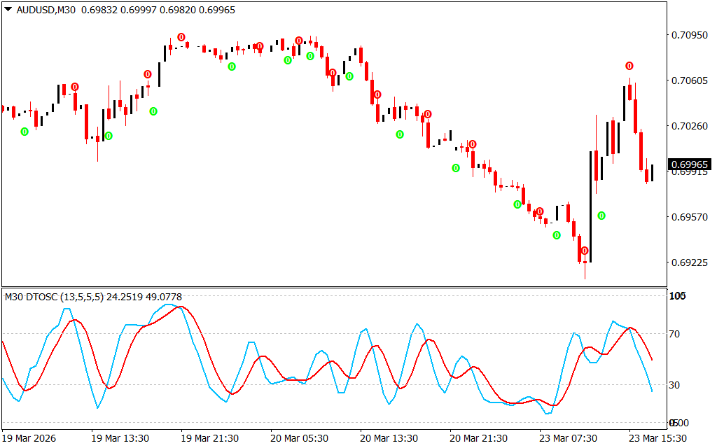The DTOSC indicator is displayed in a separate window below your price chart and consists of two lines: