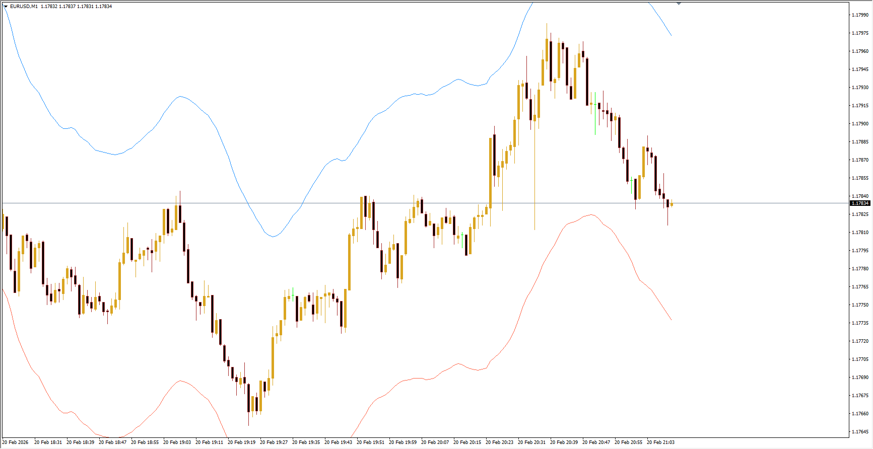 Visually, the indicator forms a “tape” that surrounds Price Action. During strong market movements, price may temporarily break outside the bands, but it often reverts to the normal range afterward.