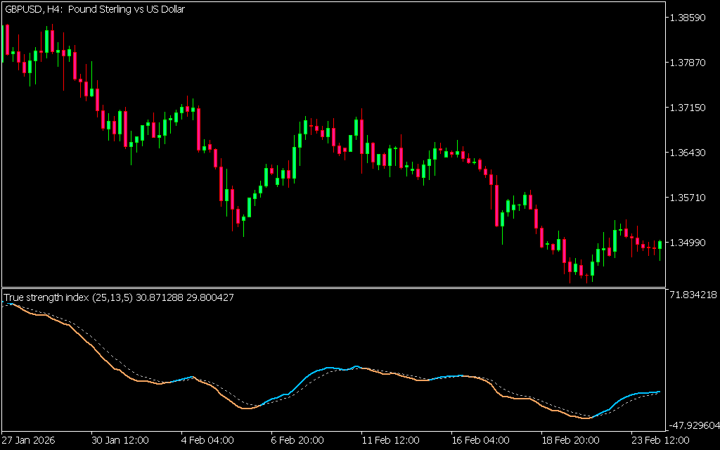 The Ergodic True Strength Index (TSI) Indicator, developed by William Blau, is a momentum oscillator similar to the MACD. It combines histograms with a smoothed moving average that oscillates around the zero line, making it easy to spot bullish and bearish market conditions. Plotted in a separate window beneath the price chart, the Ergodic TSI can be applied to any instrument and timeframe, from Scalping to long-term trading.