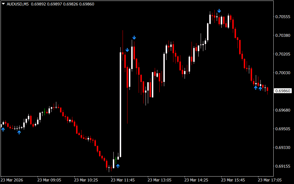 - A blue arrow appears on a bullish candle
