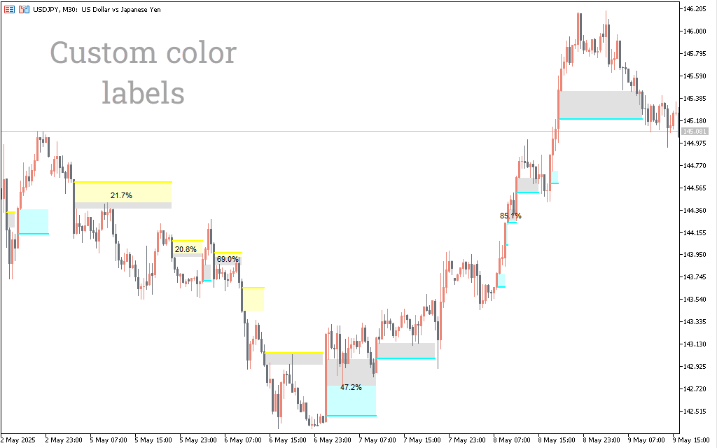 When price revisits a gap, the indicator displays a percentage label showing how much of the gap has been mitigated.
