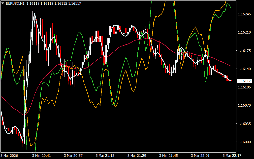 Trading signals are based on the price position relative to these lines.