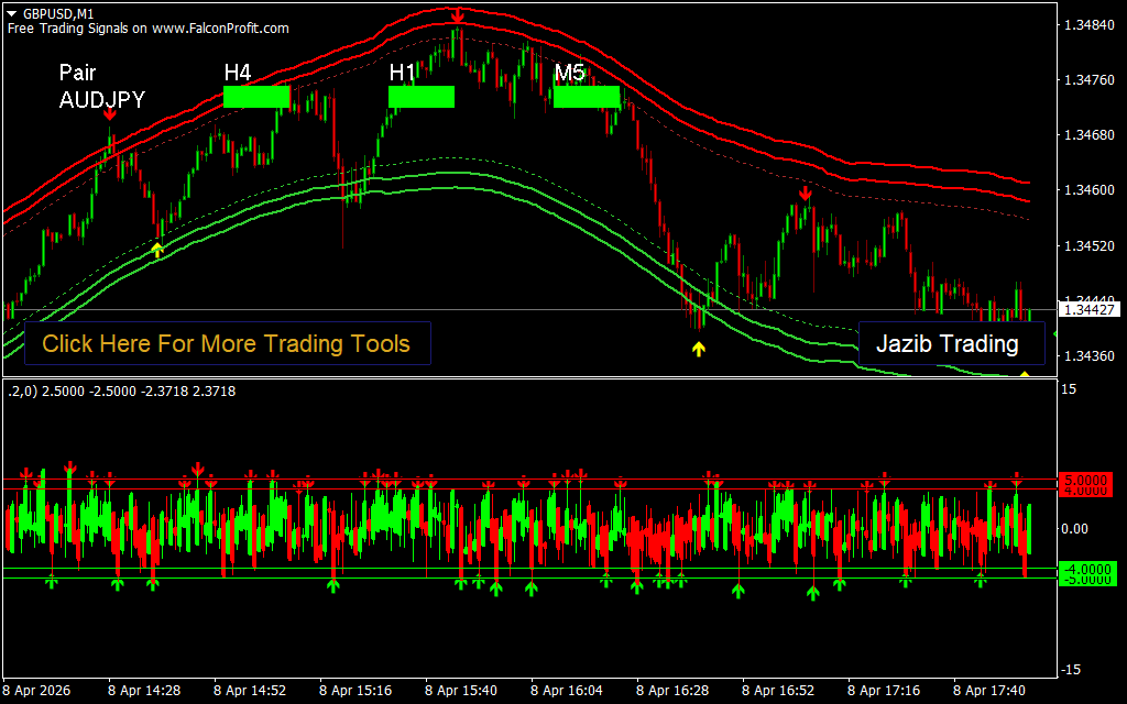 - Dynamic trend channels (red and green bands) to track market direction