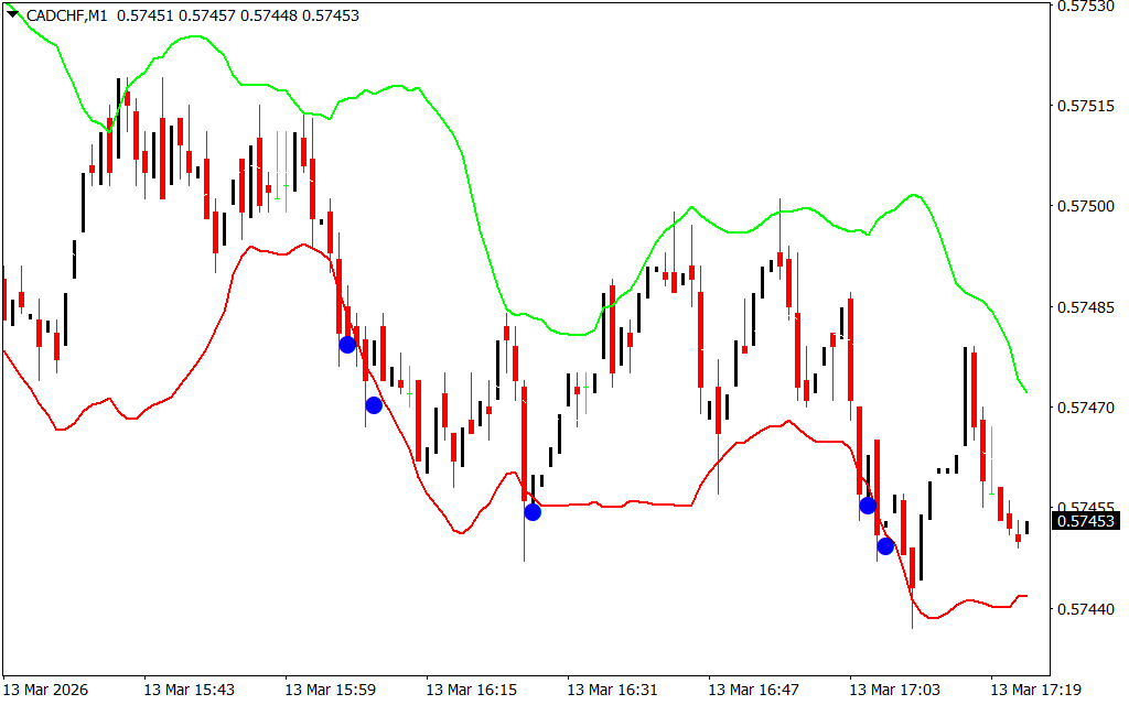 The indicator identifies bullish and bearish trends based on Price Action relative to the bands: