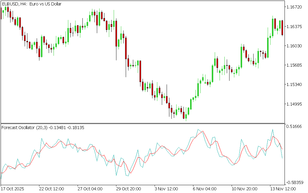 The Forecast Oscillator Indicator for MT5 is a technical analysis tool that uses linear regression-based time series forecasting to predict potential market direction. It compares current Price Action with a statistically calculated forecast value, helping traders identify possible trend continuation or reversal opportunities.
