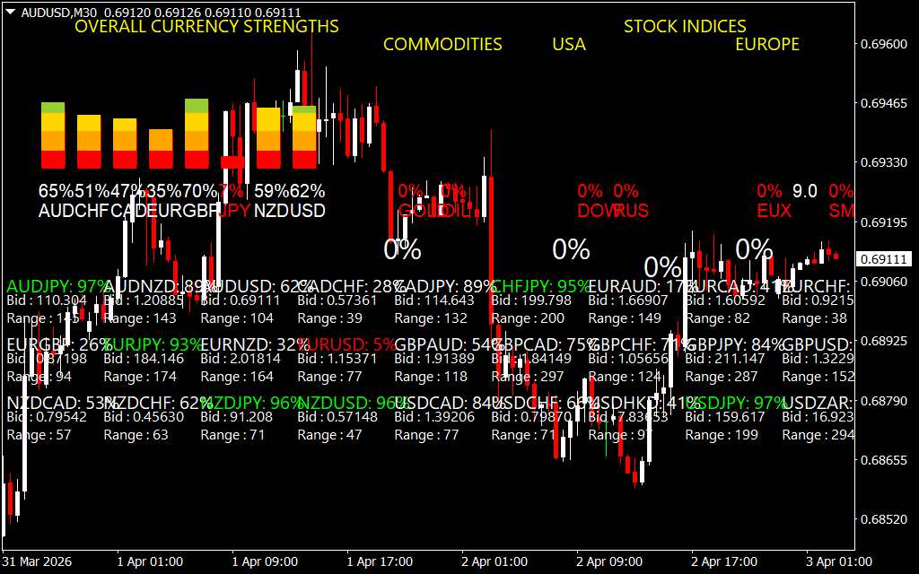 - Currency Strength Analysis: Displays major currency strengths in percentages for quick trend identification.