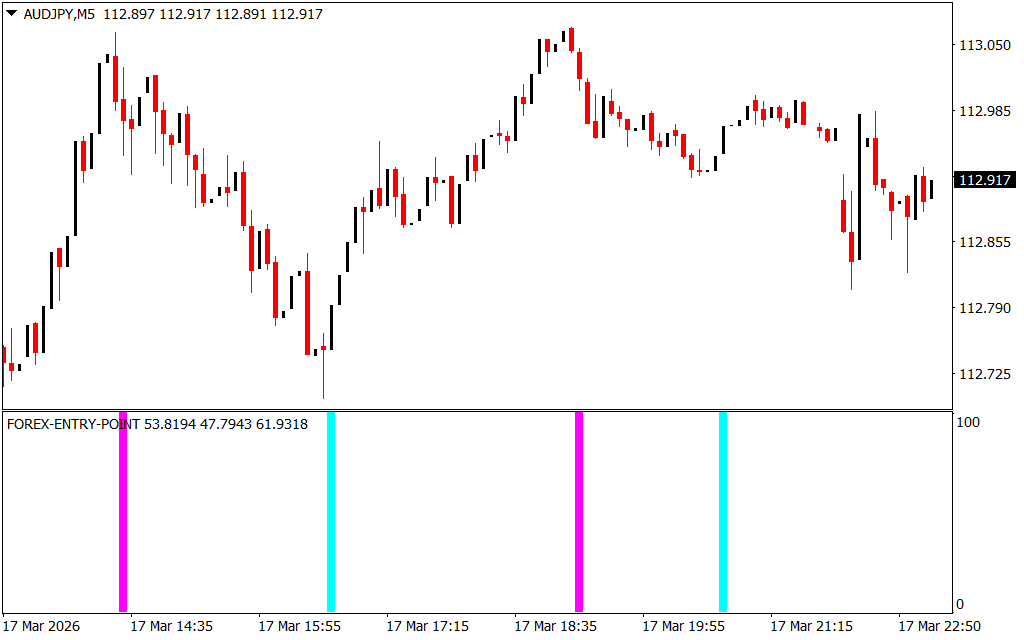 The Forex Entry Point Indicator is designed to predict potential price movements and highlight possible market reversals. Instead of cluttering the chart, it displays signals in a separate window below the price chart.
