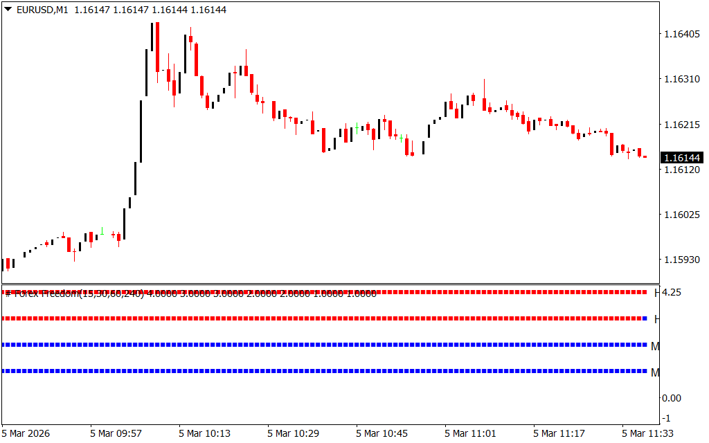 The Forex Freedom Indicator for MT4 is a practical tool that simplifies multi-timeframe analysis by combining CCI readings from several timeframes into a single indicator. This helps traders quickly identify the dominant trend and align their trades accordingly.