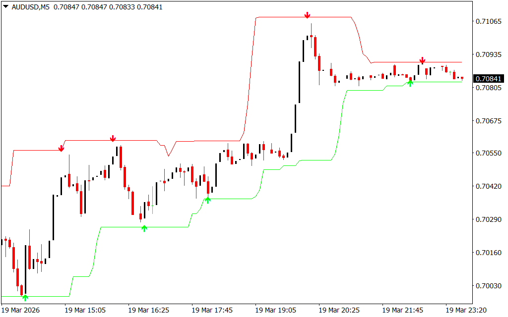 The indicator simplifies trading by combining directional arrows with a price channel: