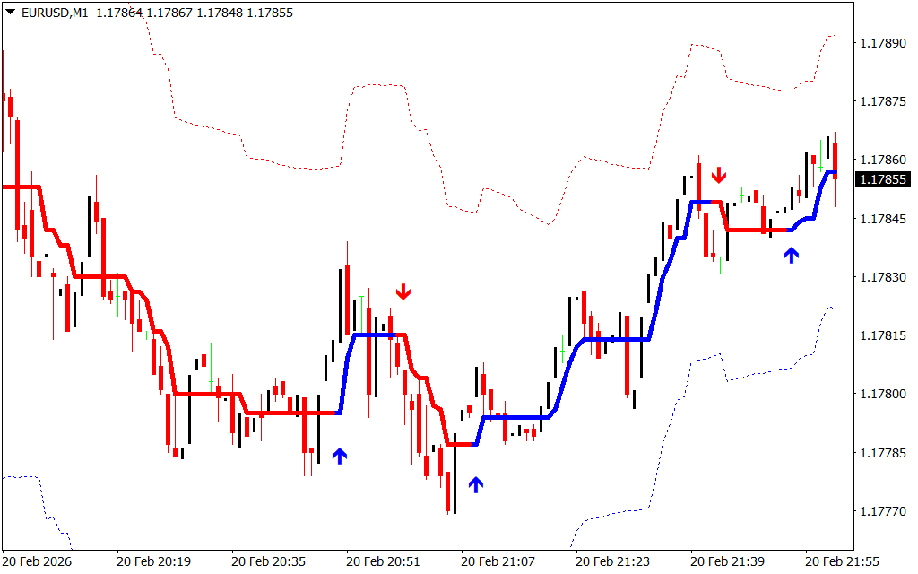 The indicator builds its signals around two dynamic dotted volatility channels plotted around Price Action: