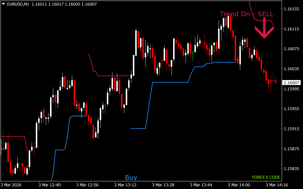 - Visual Alerts: Displays BUY/SELL text and trend direction arrows for quick interpretation.