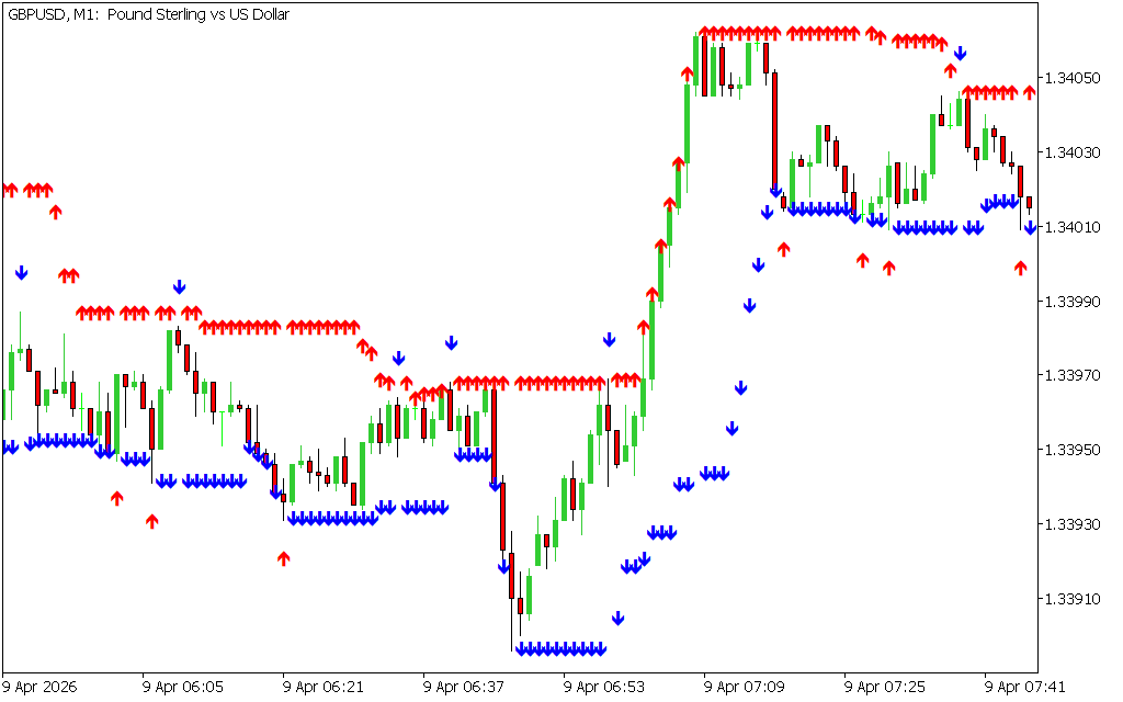 On the EURUSD M30 chart, the indicator plotted a red arrow below price during a bullish trend. This coincided with a bullish engulfing candlestick pattern, confirming a buy entry. Similarly, in a bearish trend, a blue arrow above price can be validated with bearish candlestick formations for sell entries.