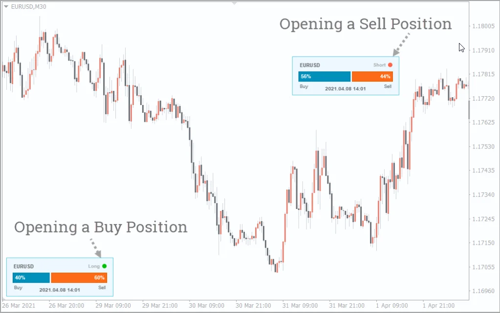 The Sentiment Lite indicator displays the percentage ratio of buyers and sellers directly on your MT4 chart using a visual scale.