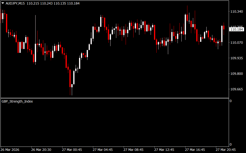 The indicator plots the GBP index as a line in a separate window, representing the overall strength of the currency: