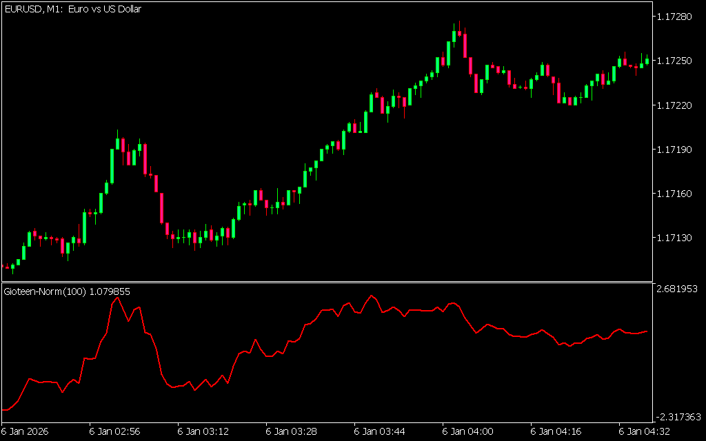 The Gioteen Norm is a momentum-based oscillator that evaluates market direction by analyzing price behavior relative to its internal trend calculation.