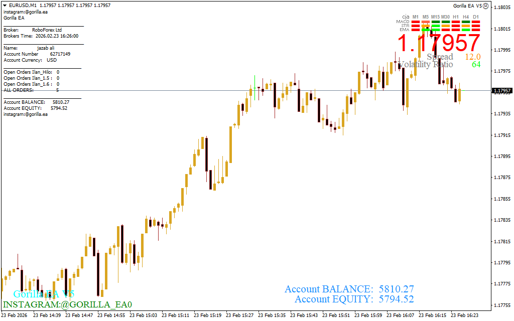 Gorilla EA V5 operates as a precision scalper focused on short-term market impulses. It waits for volatility and momentum alignment before entering trades.