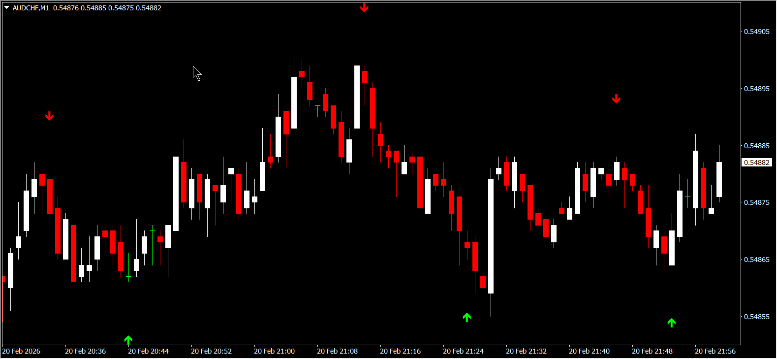 Arrows are generated when multiple internal conditions align, including trend direction, momentum strength, and volatility filtering. Rather than acting as instant “click-and-trade” commands, these arrows should be viewed as high-probability entry zones.