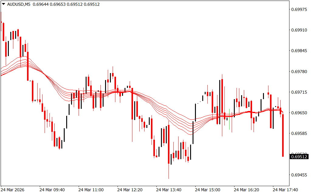 These EMAs are displayed in red and are specifically designed to track long-term market trends. By using exponential moving averages instead of simple ones, the indicator reacts faster to price changes, reducing lag and improving signal accuracy.