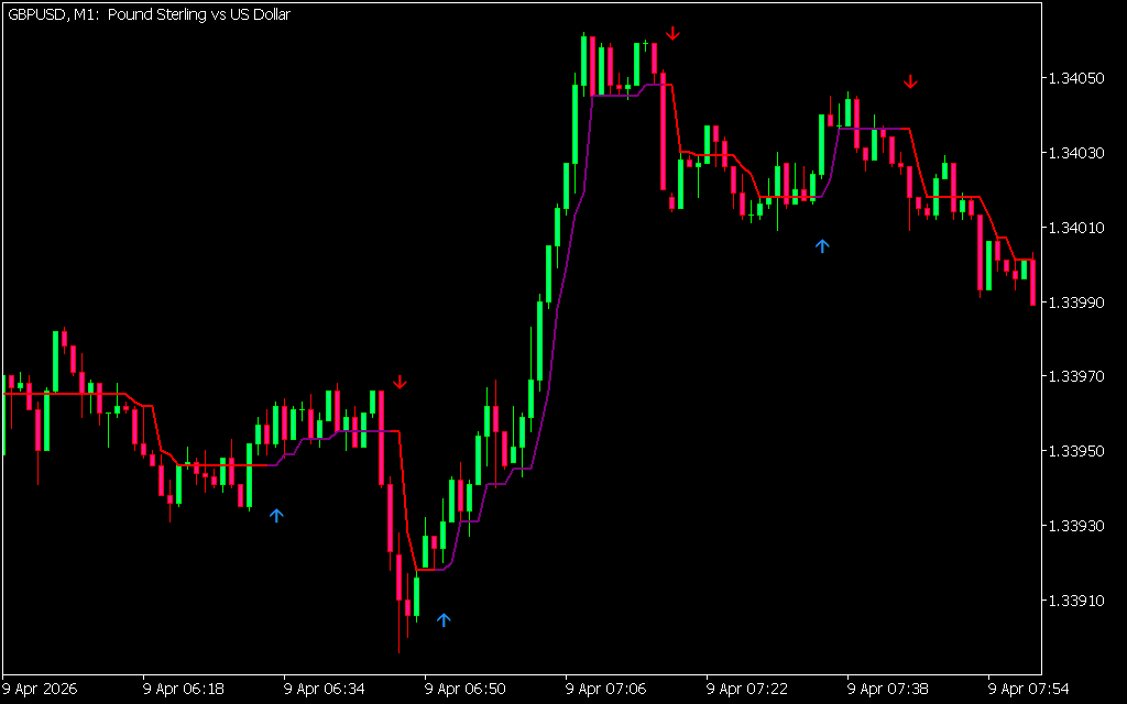 On the CAD/JPY H1 chart, the Half Trend Buy Sell Indicator plotted a purple line, signaling a buy entry. Later, when the line turned red, it indicated bearish momentum and a sell opportunity. Traders could use additional confirmation from candlestick patterns or oscillators to refine entries.