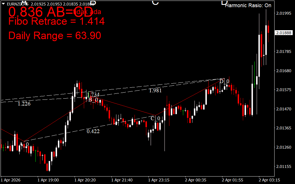 The indicator plots key patterns such as Gartley, Bat, Butterfly, and Crab. While it does not explicitly label the pattern type, it shows the five critical points—X, A, B, C, and D—guiding traders on possible price direction. - Fibonacci Retracement & Daily Range