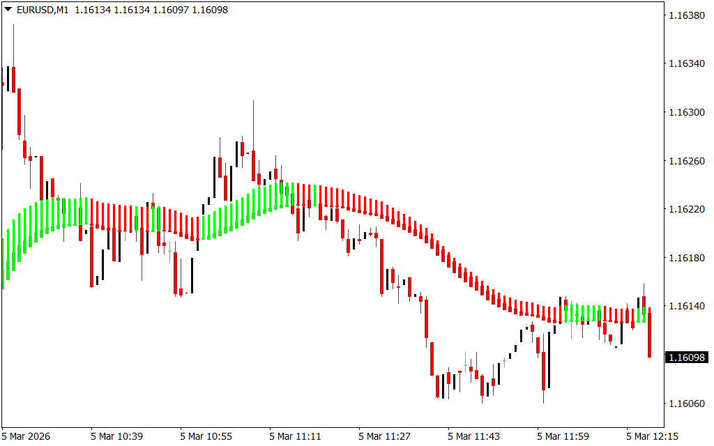 The indicator acts like a dynamic moving average, plotting red and green candles above or below candlesticks when there is strong bullish or bearish momentum.