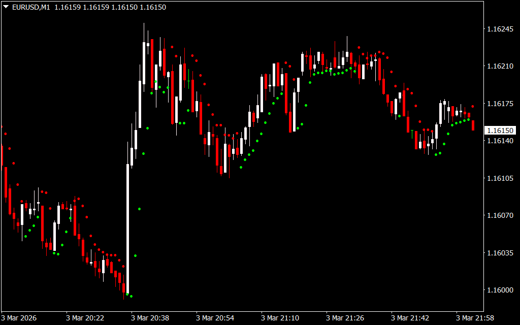 - Red dot above price: Bearish trend signal
