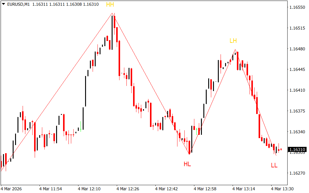 - Higher Highs (HH) – Indicates a potential downward move or bearish pressure