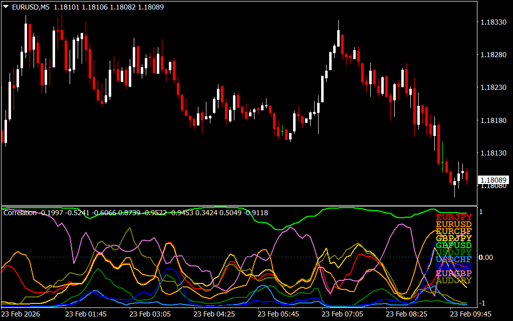 Displayed as dynamic multi-line plots, the correlation values update in real time, giving traders a clear visual understanding of how relationships evolve under changing market conditions.