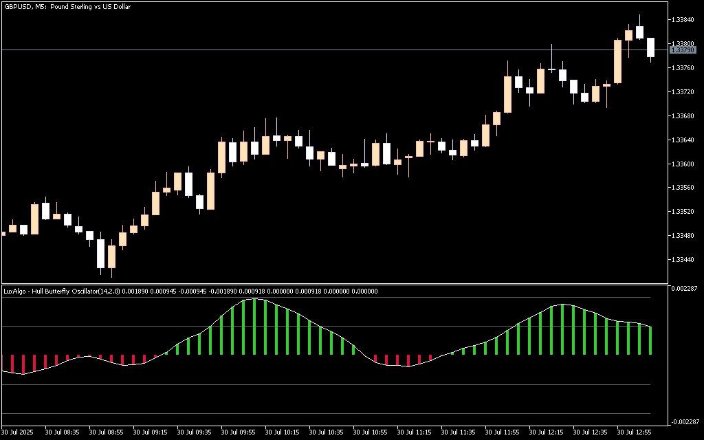 The Hull Butterfly Oscillator for MetaTrader 5 is a sophisticated Momentum Indicator developed by LuxAlgo. It blends the ultra-smooth responsiveness of the Hull Moving Average with dynamic histogram visualization to help traders identify momentum shifts earlier and with less lag.