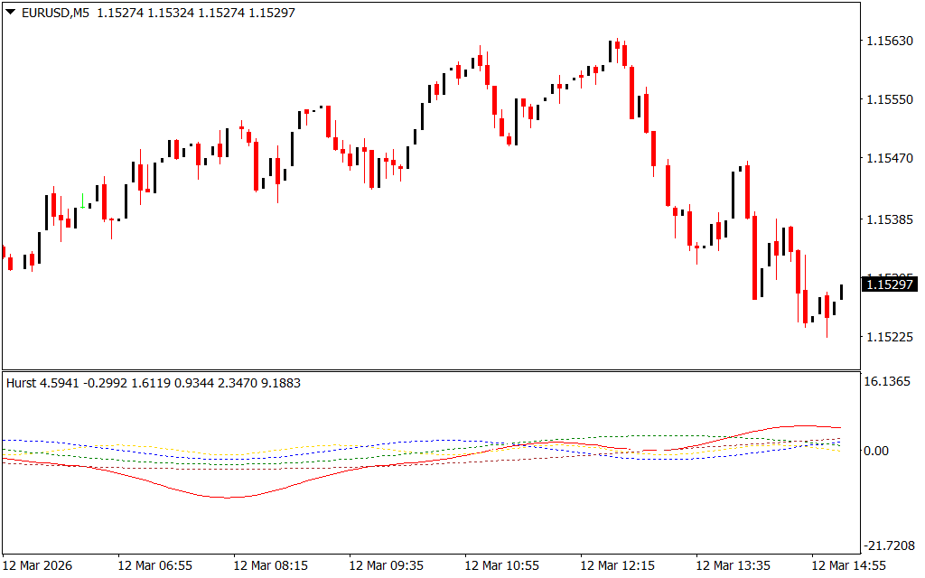 Unlike the traditional Hurst exponent representation, this MT4 indicator displays values oscillating between positive and negative levels, making it easier to interpret visually on a trading chart.