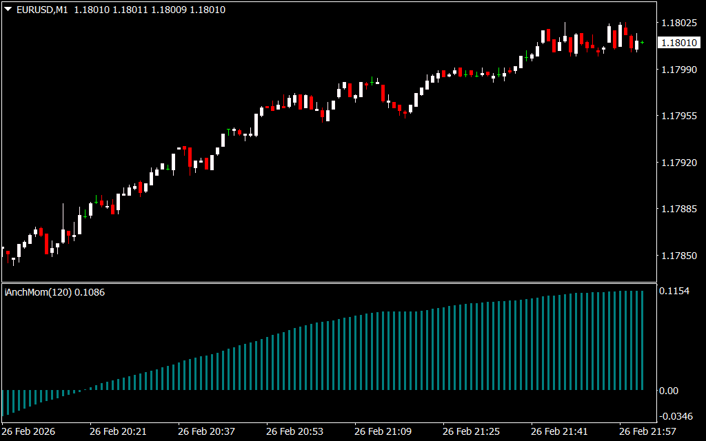 The iAnchMom Indicator for MT4 is a momentum-based trading tool that calculates market strength using a combination of the Exponential Moving Average (EMA) and Simple Moving Average (SMA). It displays the result as a histogram in a separate indicator window, helping traders quickly identify trend direction and shifts in momentum.