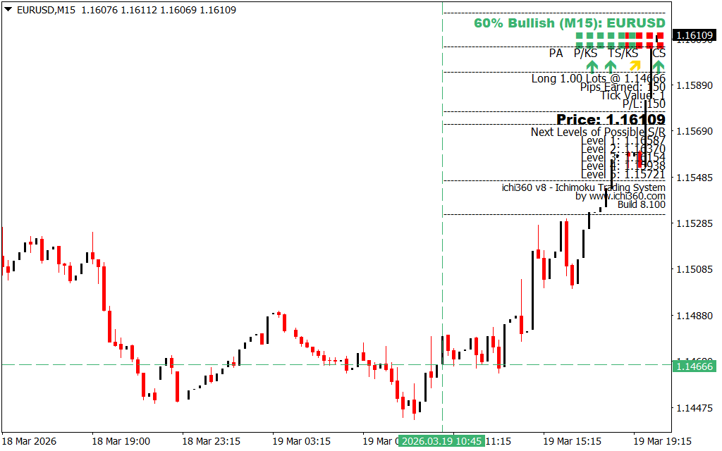 The indicator includes a powerful panel that breaks down market conditions using Ichimoku components: