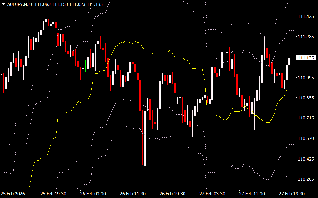 The indicator plots dynamic envelope bands around the price, which act as: