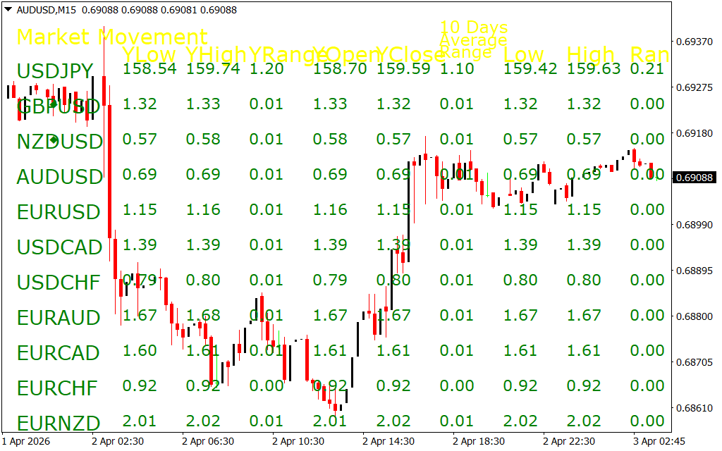- Range Comparison: Shows current range vs. 10-day average range percentage.