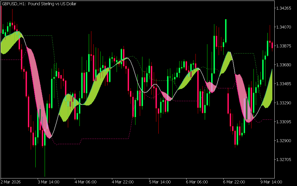 - Bearish Signal: When the indicator turns pink, traders can enter a sell position. Place a stop loss above the previous swing high and set take profit accordingly.