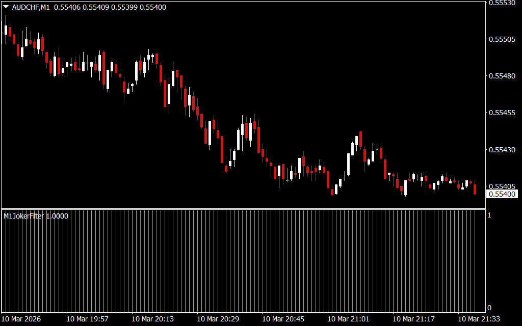 The Joker Filter appears in a separate window below the price chart and displays vertical color-coded bars that represent the current market trend.