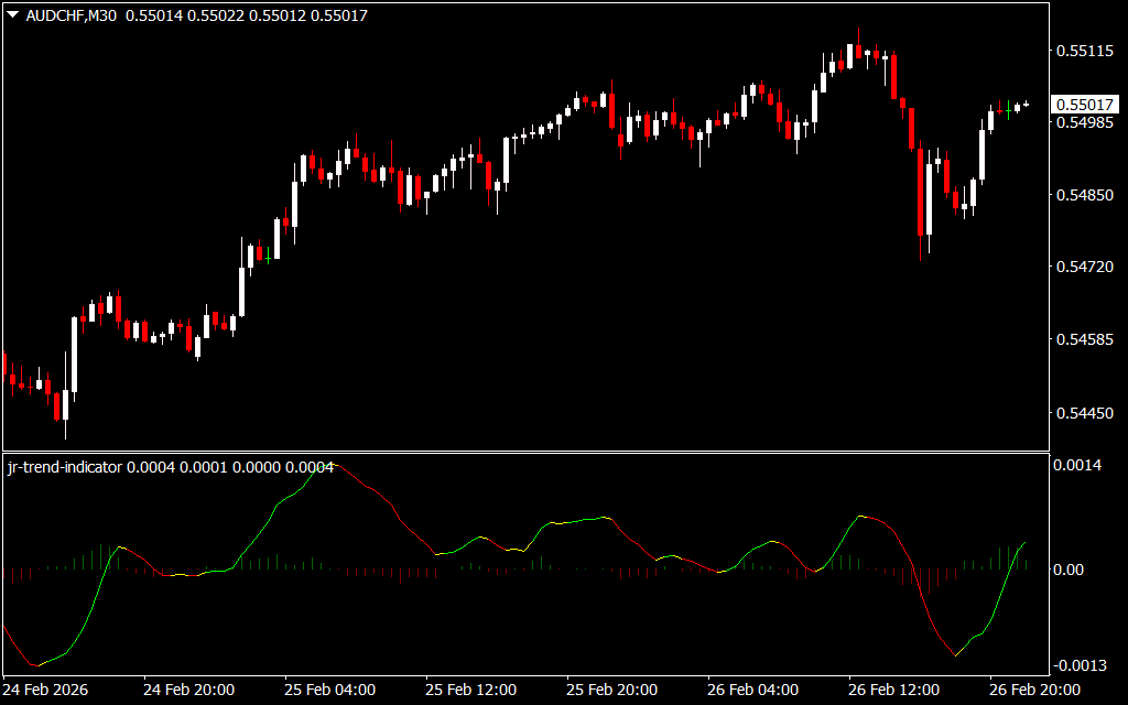 The JR Trend Indicator for MT4 is a moving average–based trend detection tool that combines a 21-period EMA with a 5-period SMA to identify bullish and bearish market direction. It displays its analysis through a color-coded histogram and multi-color signal line, making trend recognition fast and straightforward.
