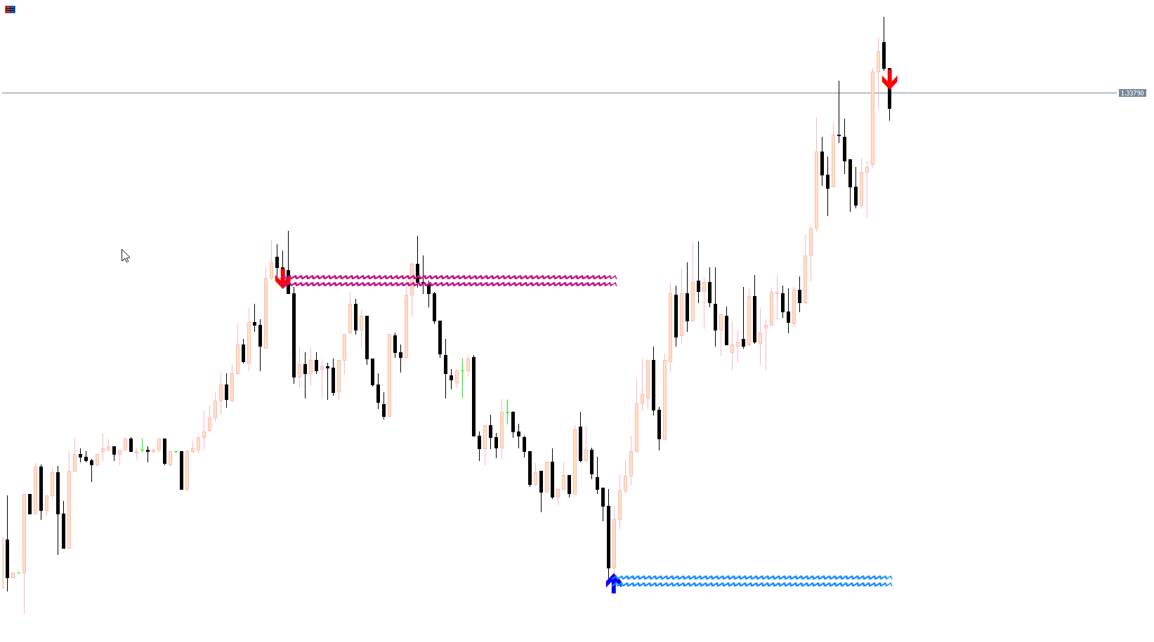 Wavy horizontal lines appear after each signal, marking the projected trend direction