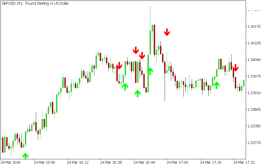 When the fast SMA crosses above the slow SMA, a bullish signal is generated with a green arrow. Conversely, when the fast SMA crosses below the slow SMA, a bearish signal appears with a red arrow. These signals allow traders to act quickly on emerging trends.