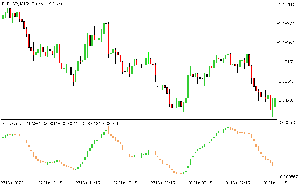 The MACD Candles Indicator for MT5 is a custom tool that displays the direction and position of the MACD line relative to the zero line. Unlike the standard MACD, this indicator provides multi-timeframe information directly on the chart, helping traders quickly assess the overall market trend without switching between charts. It is suitable for scalpers, intraday traders, and long-term investors alike.