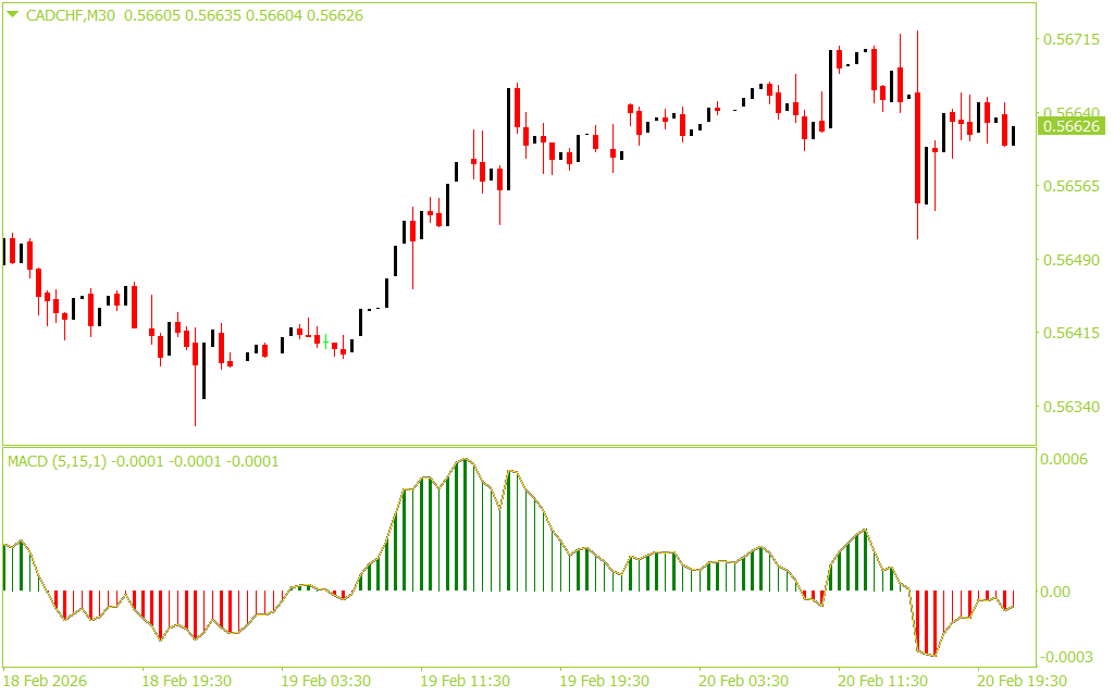 The MACD Colored Indicator simplifies momentum tracking by applying intuitive color transitions to the histogram bars: