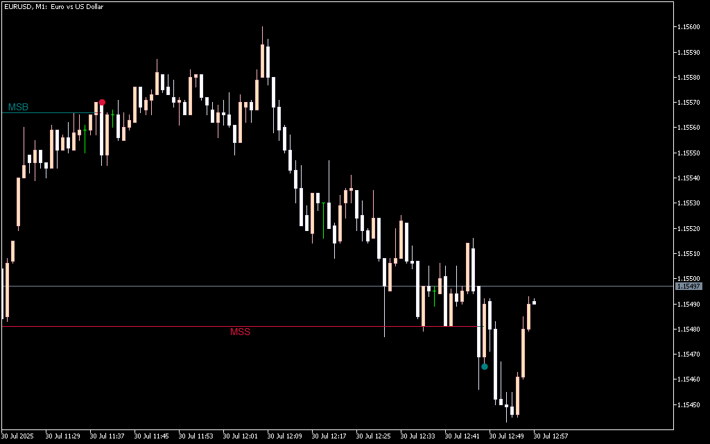 - Bullish MSB (Teal): Appears when price breaks above a previous swing high, signaling potential bullish continuation or reversal.