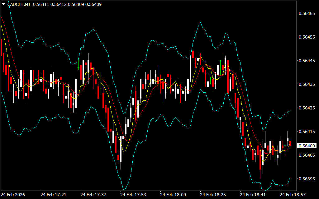 The indicator generates dynamic trading signals using a central moving average line and volatility bands: