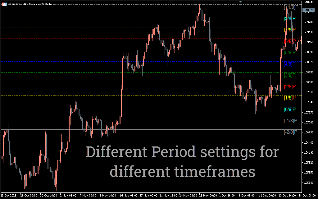 The indicator divides the price range into eight major levels, each representing a potential trading zone. These levels help traders understand where price is likely to react, reverse, or consolidate.