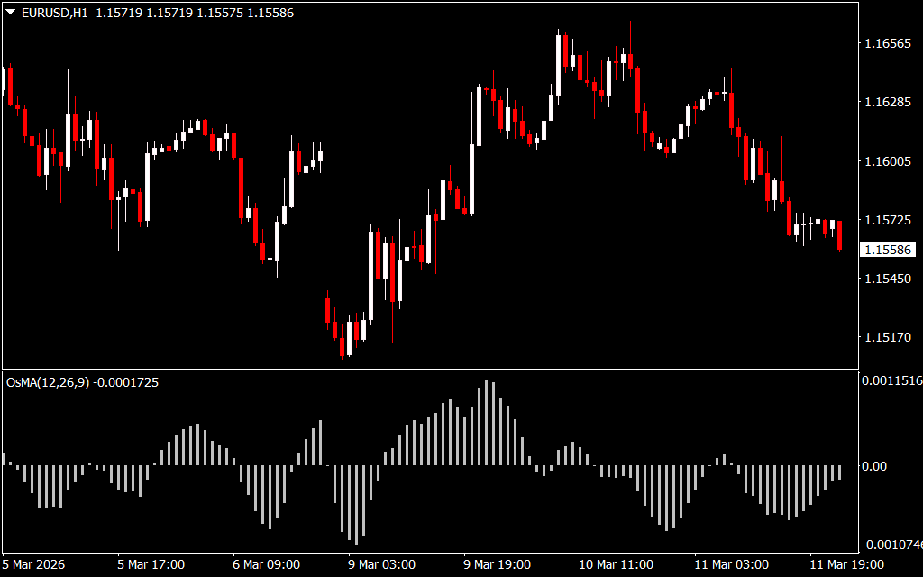 The OsMA forms a histogram below the price chart that visually shows market momentum and potential reversal zones.