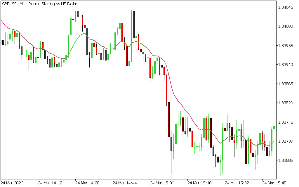 - Bearish Setup: When the MA turns pink and price drops toward the line, traders can consider short positions.