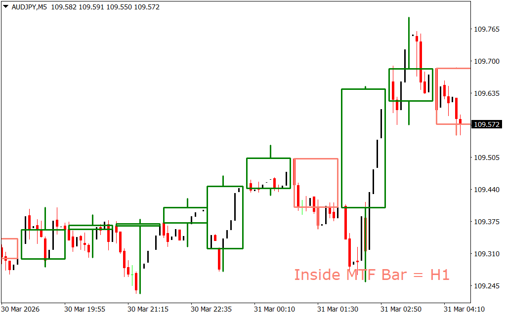 The indicator displays candlestick bars from a selected higher timeframe (such as H1, H4, or Daily) on a lower timeframe chart (like M5 or M15).